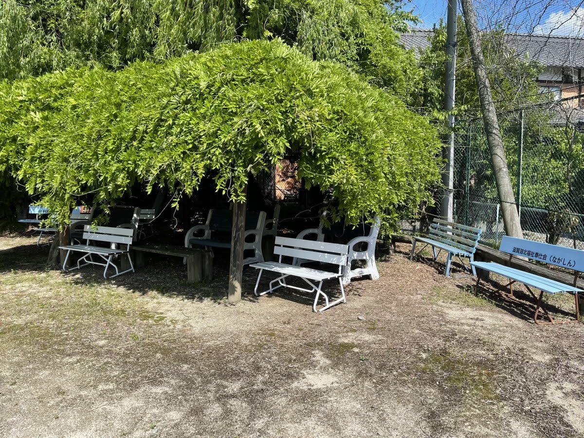 ベンチの休憩場所が設置されているのですが、すごく変わったトトロのような休憩所になっています。